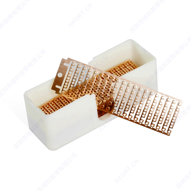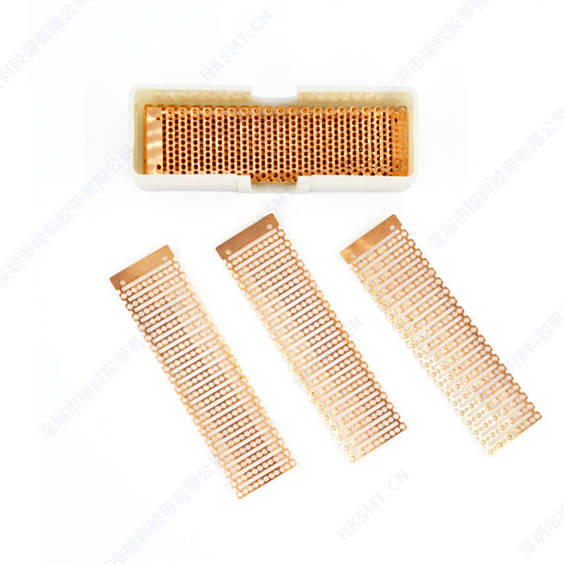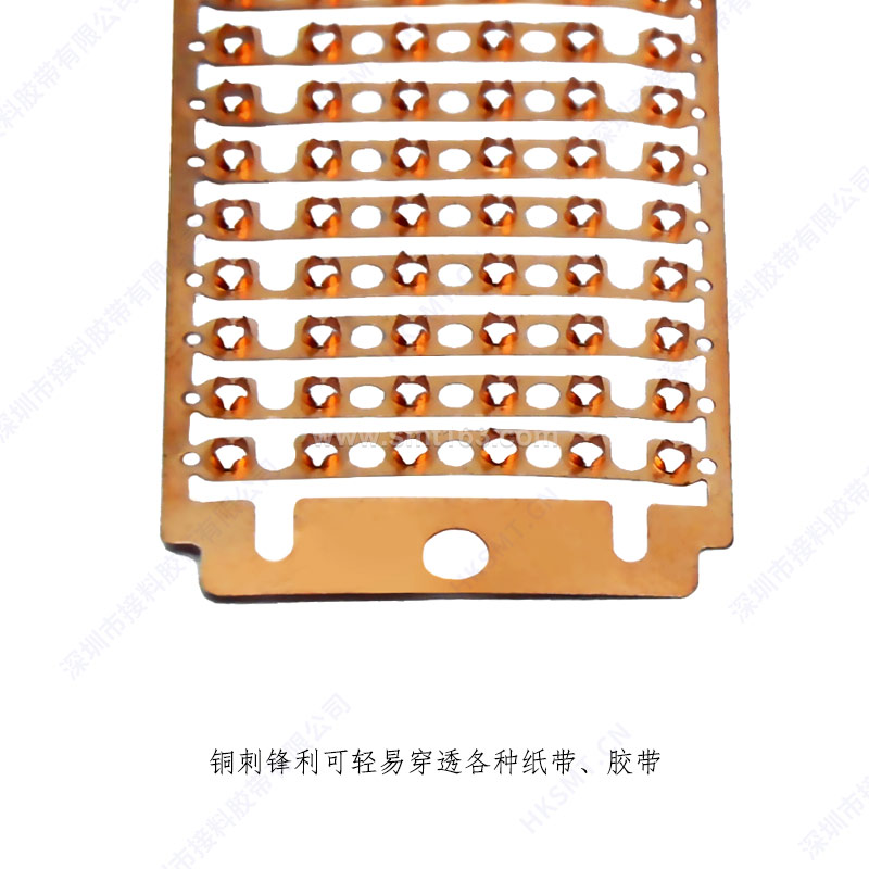 接料銅扣的材質(zhì)和市場上的很多產(chǎn)品不同,由0.1mm厚的磷銅沖壓而成,銅刺鋒利,可輕易穿透各種紙袋,膠帶,適合接8mm-72mm寬的各種料帶.產(chǎn)品特點?接料銅扣:磷銅制成、韌性強,可實現(xiàn)不停機接料,提高效率,降低成本,減少損耗,配合接料鉗使用,接料更牢固,銜接更好。?接料銅扣是連片式(單片有20個銅扣),不用每次都要放銅扣進去,所以省去了很多時間。